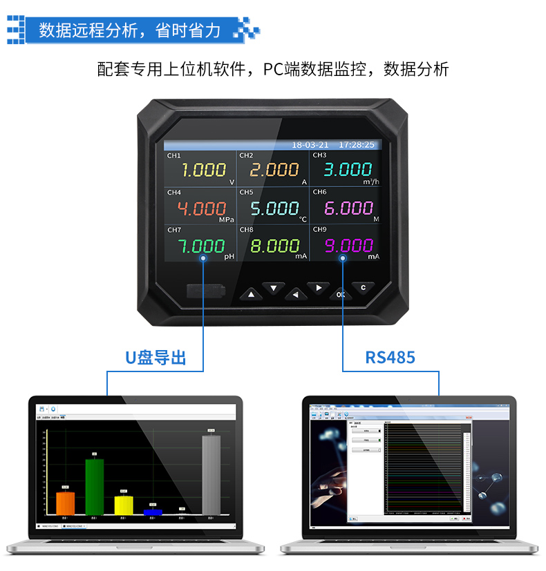 無紙記錄儀是將采集的數(shù)據(jù)/運(yùn)算數(shù)據(jù)以時(shí)間為基軸記錄在儀器內(nèi)部的存儲(chǔ)系統(tǒng)中,無消耗任何常用的記錄設(shè)施,如:紙張、筆墨。記錄在儀器內(nèi)部的存儲(chǔ)數(shù)據(jù),通過運(yùn)算、模擬后顯示在液晶屏。常用顯示用液晶屏比較廣泛。在液晶屏屏幕上,可以顯示數(shù)字顯示、棒圖顯示、曲線顯示、報(bào)警列表等。無紙記錄儀采集的數(shù)據(jù),常用的有:溫度、壓力、流量、液位、電壓、電流、濕度、頻率、振動(dòng)、轉(zhuǎn)速等。